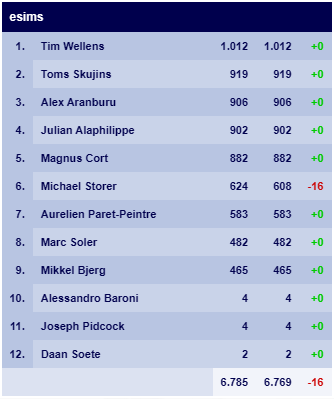 De helft van de deelnemers aan dit spel is actief op dit forum, dus ik kan hier ook wel eens een tussenstand geven. De deelnemers met Søren Wærenskjold waren de winnaars van vandaag bij de Omloop Het Nieuwsblad; naast de winnaar van de etappe ook dubbele punten, want slechts door vier mensen gekozen. De leider in het bonusspel is Mehor. Die had geen Wærenskjold, maar wel Marijn van den Berg, Lewis Askey en Lukáš Kubiš als bonusrenners in zijn team. Met zoveel speciale tekens verdien je die leiding denk ik ook wel.