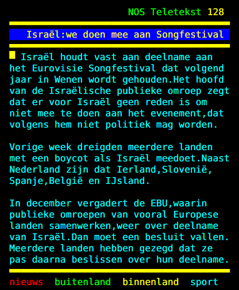 Dat is goed nieuws, dan gaat Nederland dus niet meedoen aan die poppenkast. Dat hebben we immers beloofd. Nu moet de AVROTROS de rug recht houden.