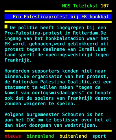 Een sportwedstrijd die spannend is, vind ik altijd een pré. Mevrouw Schouten kan Israël als ploeg dus niet weren, hooguit inderdaad het hele EK afgelasten. Dat voert wel erg ver als er wat te beteugelen valt. Demonstraties op afstand houden van het stadion en de Israëlische ploeg (extra) beveiligen zou onder andere de praktijk kunnen zijn. En hopelijk wint Nederland het toernooi. Want het gaat toch om de sport. We zijn toch best sterren in ons kleine landje in mooie teamsporten als honkbal en korfbal. Laten we dat koesteren.